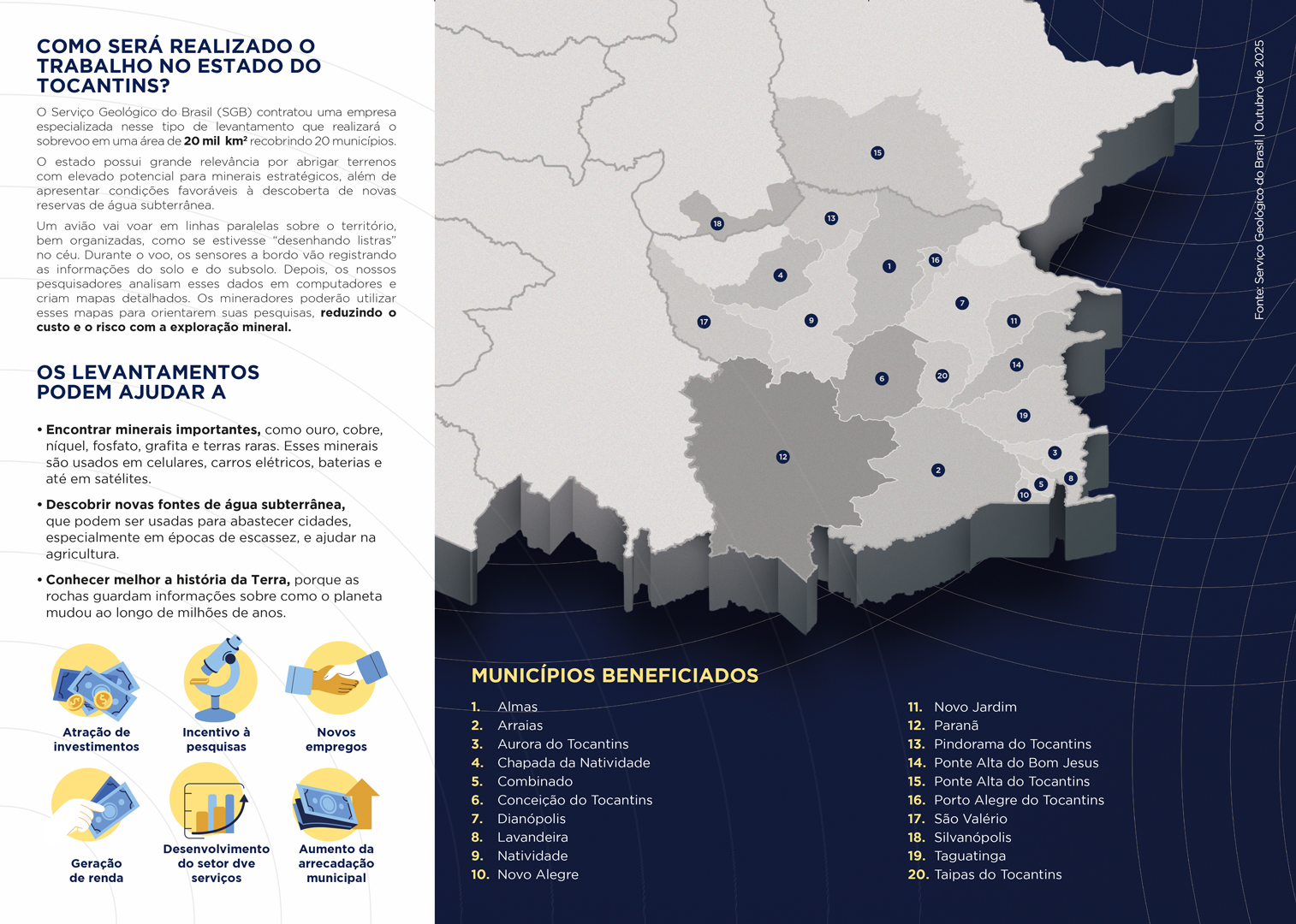 Os municípios do sudeste do Tocantins serão os primeiros a receber os voos da terceira geração do programa, realizados por meio da empresa Lasa Prospecções (Xcalibur Smart Mapping), vencedora de licitação. A área mapeada abrangerá cerca de 20 mil km², contemplando 20 municípios: Almas, Arraias, Aurora do Tocantins, Chapada da Natividade, Combinado, Conceição do Tocantins, Dianópolis, Lavandeira, Natividade, Novo Alegre, Novo Jardim, Paranã, Pindorama do Tocantins, Ponte Alta do Bom Jesus, Ponte Alta do Tocantins, Porto Alegre do Tocantins, São Valério, Silvanópolis, Taguatinga e Taipas do Tocantins.